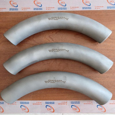 In this picutre is 8 inch pipe (219.08mm), material SS316L, Sch10 (3.76mm), bending radius 5D (5D bend 90° Elbow) = 5*219.08 = 1095.4mm or any size as required